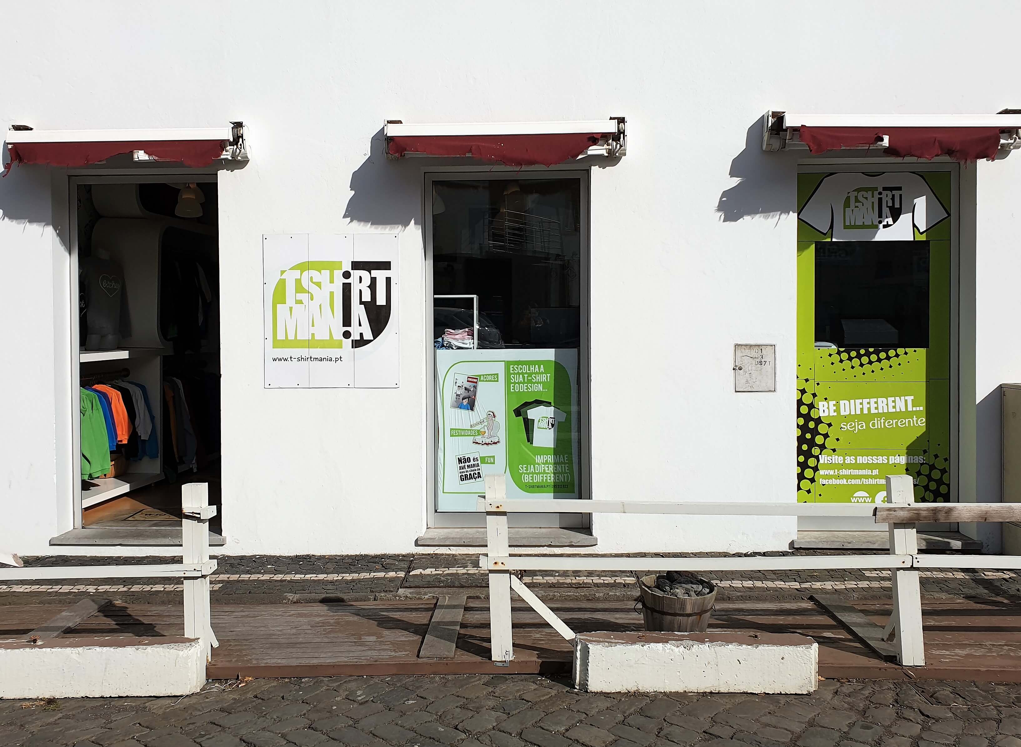 Elaborámos e acompanhámos o projecto de instalação do novo espaço comercial na cidade da Praia da Vitória. A empresa faz a impressão personalizada em têxteis (sweats, t-shirts, pólos, aventais, etc…) com três processos diferentes, impressão direta, impressão numa cor (transfer) ou em várias cores (transfer). Os clientes podem usar um desenho pré-definido, levar o seu próprio desenho ou pedir para o criar.